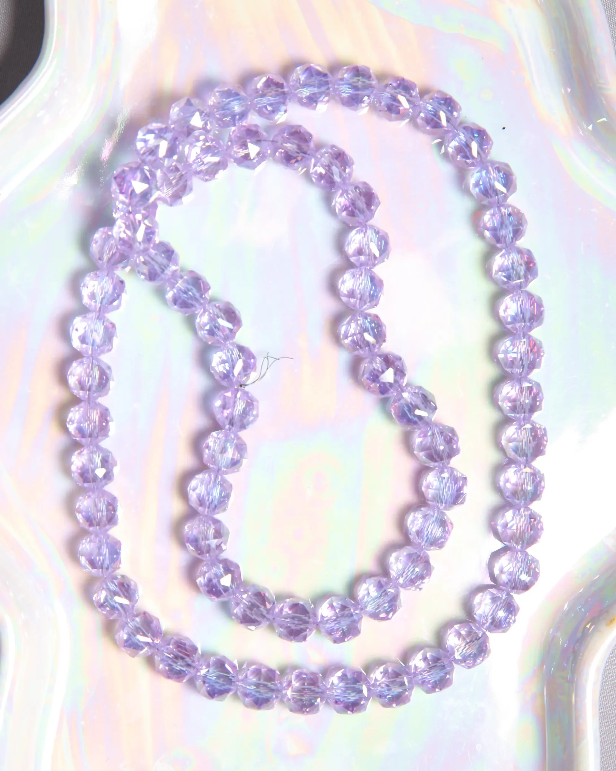 Les perles cristal violet clair rondelle facetté en verre 8×8 mm sur fil révèlent une teinte violette douce et lumineuse, sublimée par des facettes qui captent la lumière. Elles apportent une touche délicate et brillante aux créations de bijoux, parfaites pour mettre en valeur bracelets et bijoux élégants.